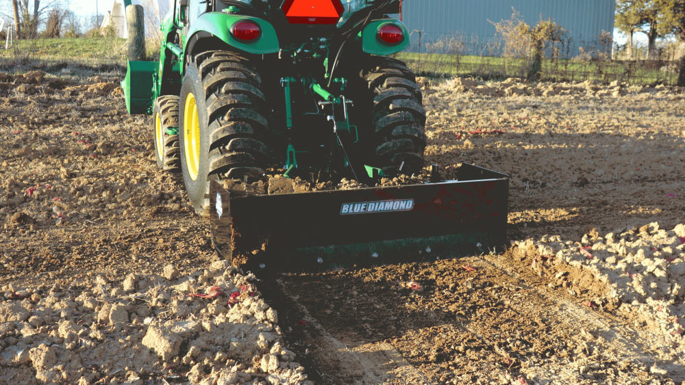 For tougher jobs, the Heavy Duty Blue Diamond® Box Blade scraper will stand up to the tasks required to maintain your farm, building site, or landscaping projects. This unit makes quick work of ripping up dirt, grading and leveling land or spreading soil. Models are available in 3 working widths from 72” to 96”, have adjustable heavy-duty ripper shanks, are compatible with a Category 1 and Category 2 quick hitch, and are designed to work with 30 hp to 70 hp tractors.