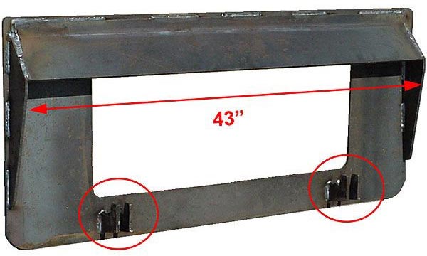 Mounting plate for early model, large frame New Holland and John Deere skid steers. It is fully welded and comes unpainted. This mounting plate measures 43 inches across and weighs 68 pounds.