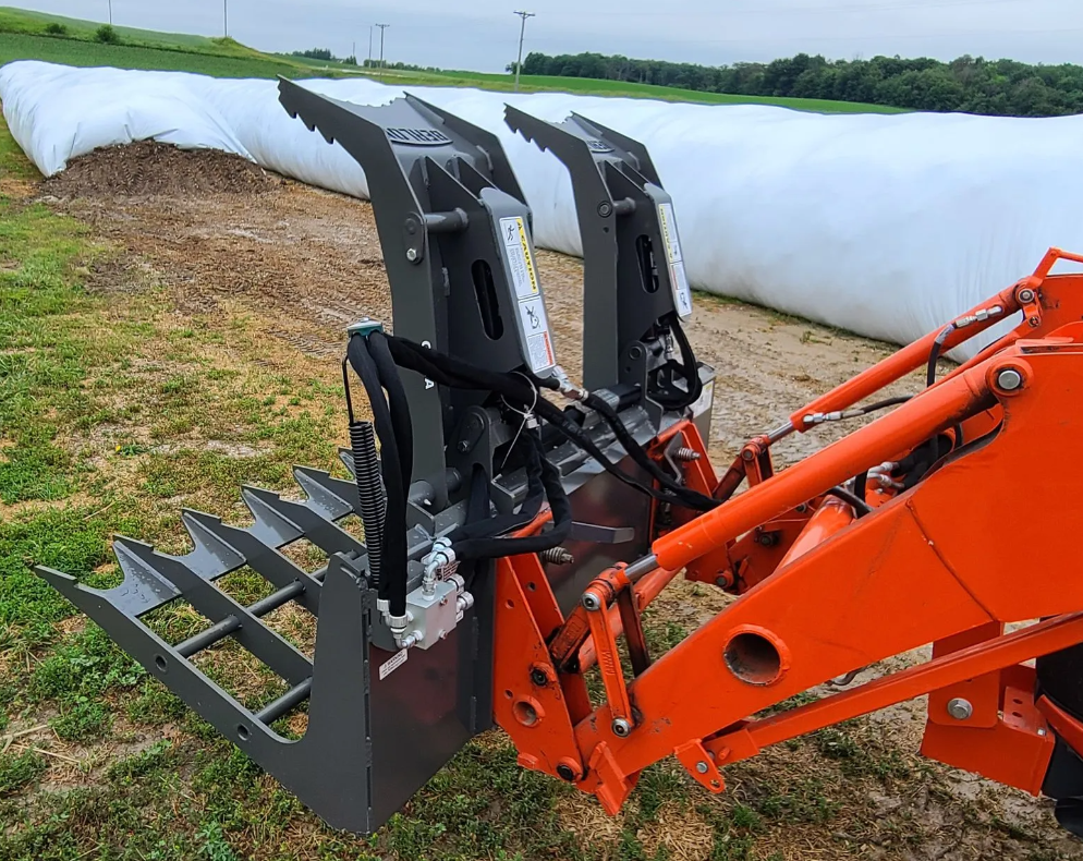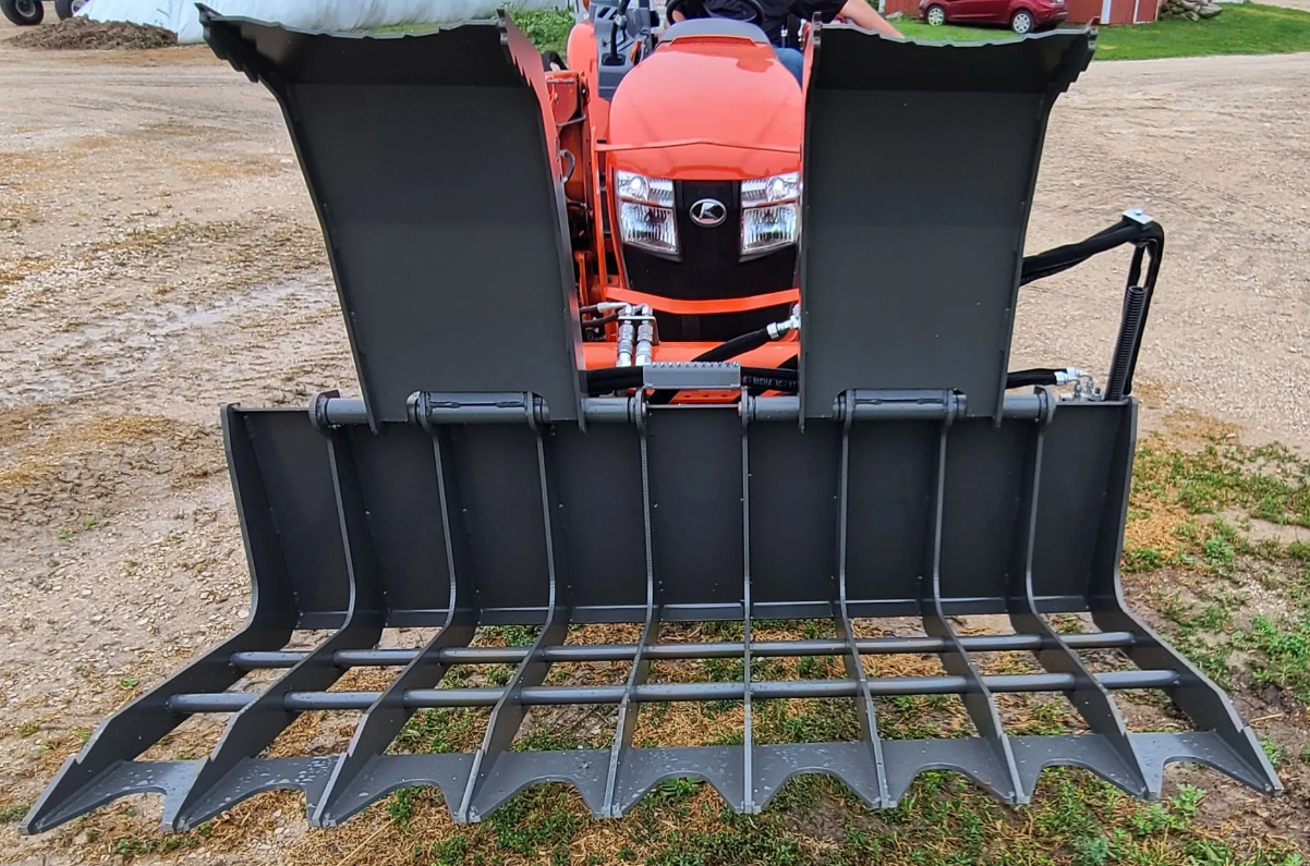 The G-72AB Root Grapple by Berlon, is designed for efficient debris removal, woodlot cleanup, agricultural work, manure handling, bale transport, and area clearing. Its open bucket construction allows dirt and smaller materials to sift through, ensuring a cleaner load.