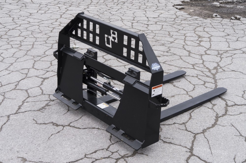 The hydraulic pallet forks allow the operator to change the fork tine spacing from the seat of the skid loader by using the auxiliary hydraulic flow. The walk through frame style make entering and exiting your skid steer very easy yet still provides protection and great visibility.