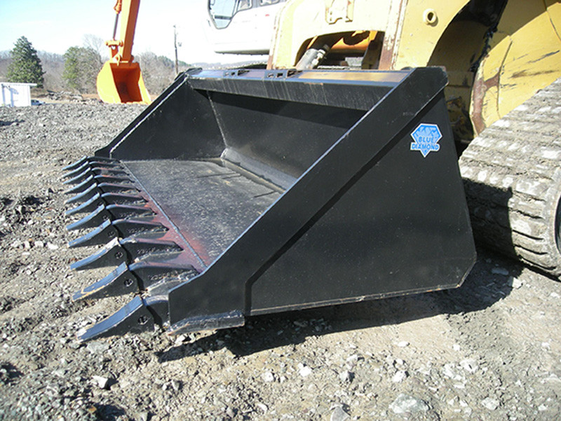The low profile tooth buckets are designed with heavy reinforcement and heavy duty cast side pinned teeth. Available in 60”, 66”, 72”, 78”, and 84". Recommended for machines 60 HP or less. For higher horsepower machines please see Blue Diamond Severe Duty Skid Steer Tooth Bucket.