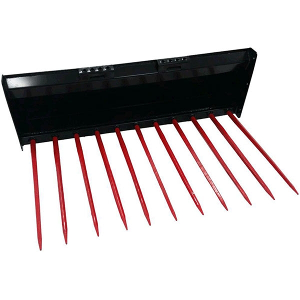 The skid steer Manure Fork attachment comes in 6 different widths 54", 60", 66", 72", 78" and 84". The number of tines for the attachment depends on the width you choose (see chart below). The tines are replaceable. Tines come in 32 inch length. The body of the Manure Fork attachment is fully welded and powder coated. This allows the attachment to stand up to acidic material such as manure and other waste. Comes with our universal mounting plate. If your skid loader is not universal please call customer service to order.