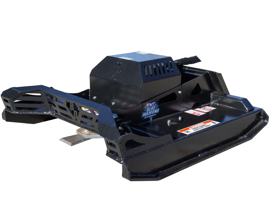 This Open Front Mini Skid Steer Brush Cutter by Blue Diamond has the strongest torque in its class. The bi-directional direct drive motor is brutally strong allowing this cutter to slice though brush up to 4" in diameter. The open front design allows this unit to cut down trees right at the base without have to raise and tilt the unit to expose the blades.