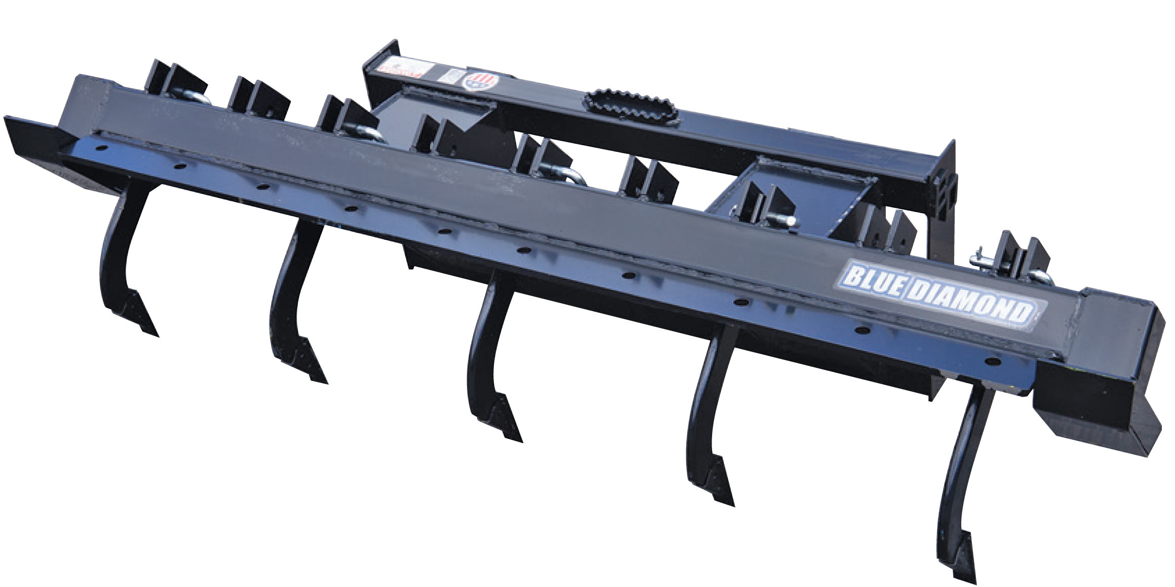 Our Blue Diamond® Attachments Skid Steer Ripper is great for penetrating the ground on farms, gardens, and driveways. You can easily prep a garden or till up some land and it’s also great for loosening up hard-packed ground. The tines on the ripper can be adjusted for more or less ground penetration. Alternative names for the ripper is tiller and field cultivator in the skid steer and related industries. The image shown includes an optional finishing rake.