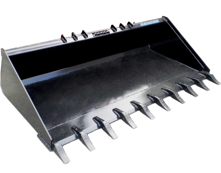 The Blue Diamond Severe Duty Low Profile Tooth Bucket is one of the heaviest skid steer bucket made. This bucket is available in standard or long bottom. The brutally heavy construction of these buckets allows them to be used in the most abusive conditions and on the largest skid steers available. Teeth are heavy duty cast replaceable teeth.