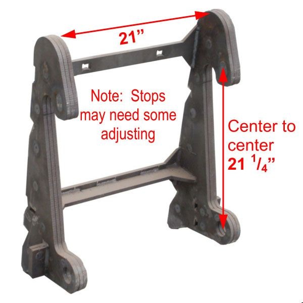Mounting plate for Caterpillar telehandlers IT series, 2 series and above. The mount is 21 inches across. The center of the hook to the pin hole is 20 inches. The plate comes fully welded and unpainted. It weighs 190 pounds.