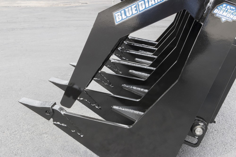 The Severe Duty Grapple Rake is available in 72", 78", and 84" widths. It is built for the most severe, demanding applications such as demolition or logging. It comes with 3/4" tines and replaceable teeth spaced 12" apart. Grapple opens to 54".