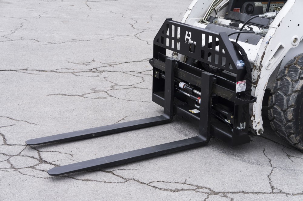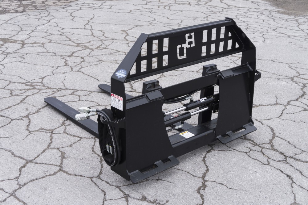 The hydraulic pallet forks allow the operator to change the fork tine spacing from the seat of the skid loader by using the auxiliary hydraulic flow. The walk through frame style make entering and exiting your skid steer very easy yet still provides protection and great visibility.