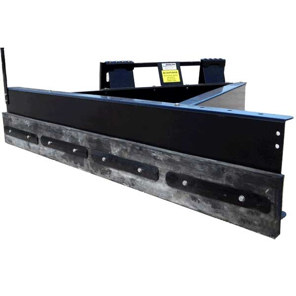 The Feed Pusher is a must for any farm or feed lot. The Feed Pusher has a height of 19 inches and a width of 96 inches. It is fully constructed of steel and has 16 different angle adjustments. Features a 1.50-inch x 10-inch adjustable and reversible full rubber cutting edge. Both sides of the edge can be used, so when one side of the edge gets worn down the operator can simply reverse it for continued use. Includes 8 inch mold board that extends past the tires of the skid steer to prevent driving over the feed.