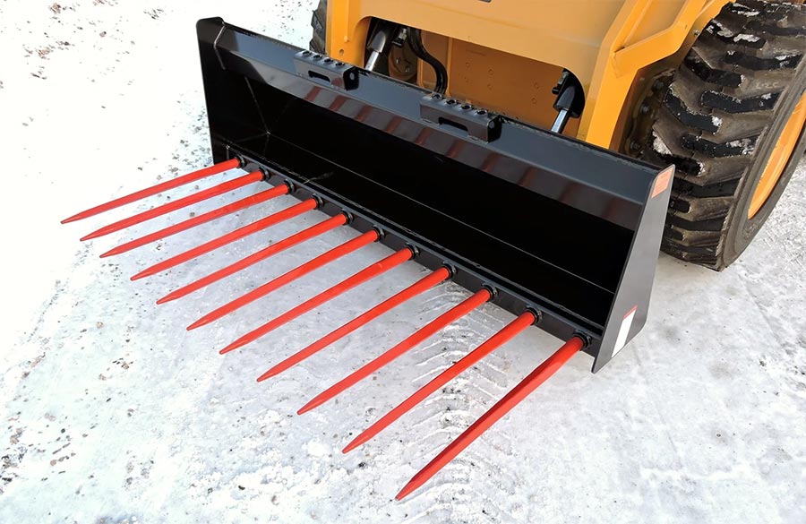 The skid steer Manure Fork attachment comes in 6 different widths 54", 60", 66", 72", 78" and 84". The number of tines for the attachment depends on the width you choose (see chart below). The tines are replaceable. Tines come in 32 inch length. The body of the Manure Fork attachment is fully welded and powder coated. This allows the attachment to stand up to acidic material such as manure and other waste. Comes with our universal mounting plate. If your skid loader is not universal please call customer service to order.