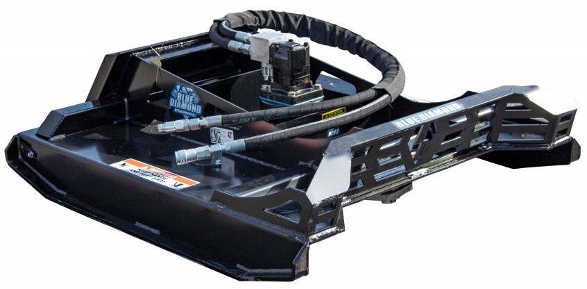 This Open Front Mini Skid Steer Brush Cutter by Blue Diamond has the strongest torque in its class. The bi-directional direct drive motor is brutally strong allowing this cutter to slice though brush up to 4" in diameter. The open front design allows this unit to cut down trees right at the base without have to raise and tilt the unit to expose the blades.