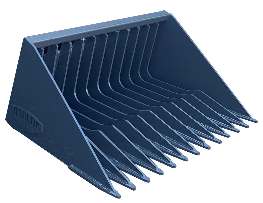 Berlon’s Mini Skeleton bucket is ideal for todays mini loaders. A rock dam and 3” tine spacing makes it a great addition for landscapers. Common uses for the bucket include rock moving.