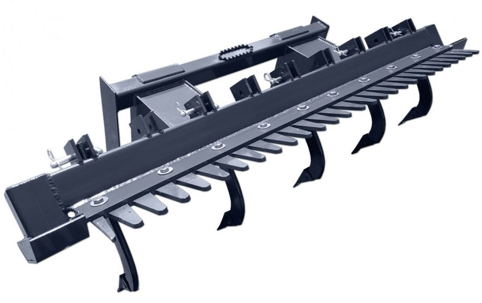 Our Blue Diamond® Attachments Skid Steer Ripper is great for penetrating the ground on farms, gardens, and driveways. You can easily prep a garden or till up some land and it’s also great for loosening up hard-packed ground. The tines on the ripper can be adjusted for more or less ground penetration. Alternative names for the ripper is tiller and field cultivator in the skid steer and related industries. The image shown includes an optional finishing rake.