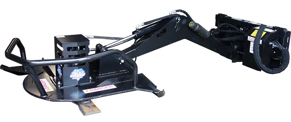 With a reach of 96" when extended horizontally and a vertical reach of 16', it makes clearing unwanted tree limbs less of a hassle. The cutter will also swing to the right and can be used as a side cutter. It is powered by a Gerolar or direct drive piston motor with a bearing housing with a 4000 max PSI. The Gerolar motor requires 14-20 GPM and the piston motor requires 17-30 GPM