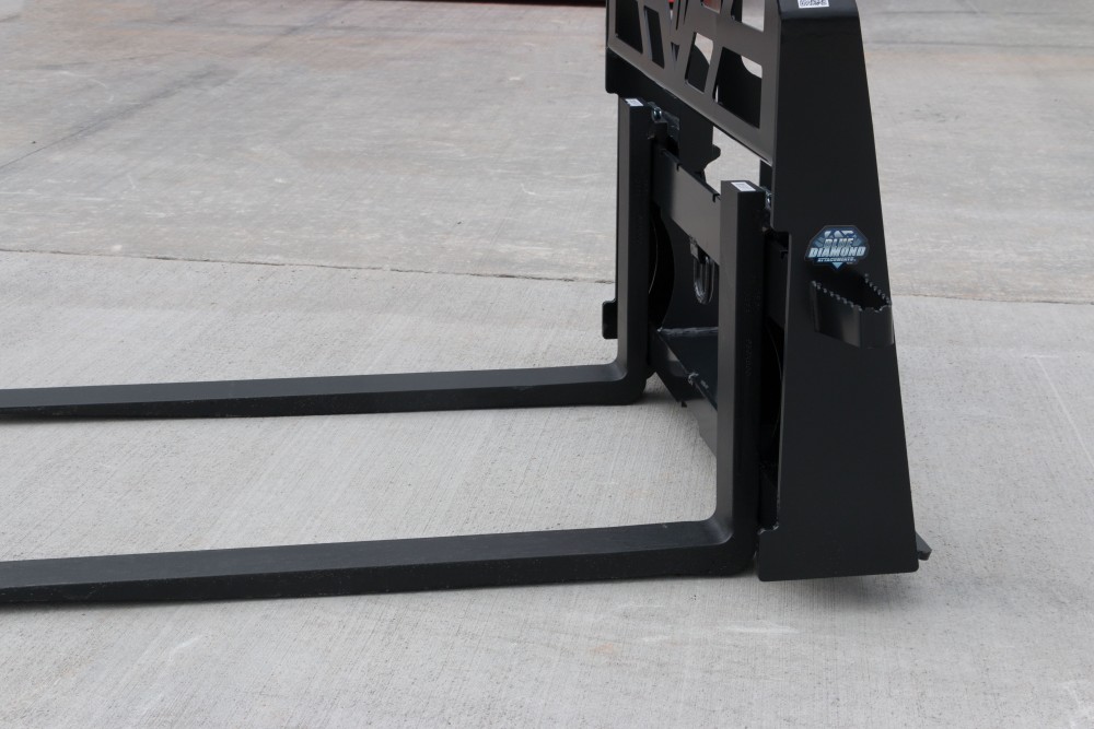 Our new Tall Frame Heavy Duty pallet forks are rated for 6,000 lbs lift. Featuring a heavier frame than our standard height Heavy Duty frame, these forks bring a few additional benefits. A heavy D ring comes standard, as do a high-visibility back rest and steps on each side. The back rest on this frame is set forward so the face of the backrest is flush with the front of the tines below. With a massive bottom frame and bracing, these forks are ready for whatever you’re lifting. Severe length adjustable tines available.