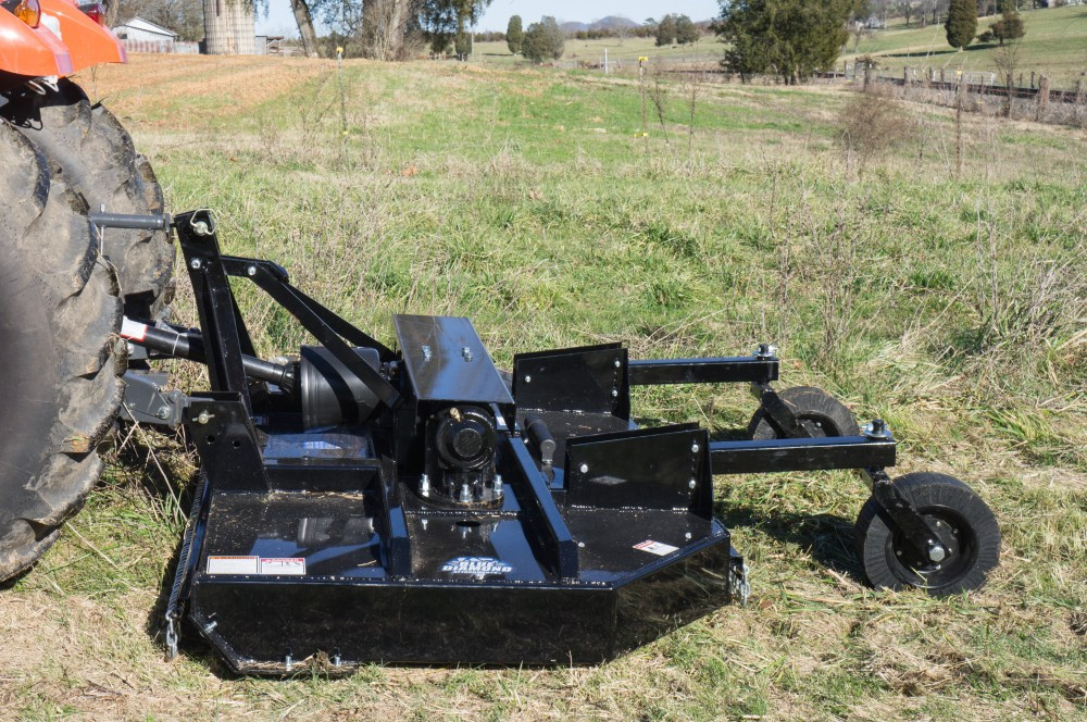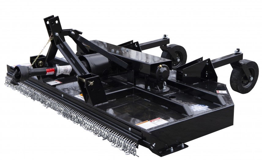 The Blue Diamond® Heavy-Duty Dual Spindle Cutters are designed for heavy-duty applications such as weeds, grass, and brush up to 3” diameter. These cutters are designed to work with a minimum 42 hp or 52 hp tractors and are available in 8’ and 10’ widths. The cutter uses dual spindles with two free-swinging blades each, which reduces the shock of impact when a stationary object is contacted. A slip clutch and dual shock couplers protect the gearboxes and drivelines from damage. These come standard with driveline and clutch shields along with front and rear chain discharge shields.