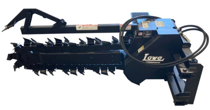 Explore the Lowe XR21HP-Series Skid Steer Trencher Attachment, engineered for top-tier trenching power and efficiency. Designed with exceptional strength and durability, it boasts a robust 50,000 lb. (22,680 kg) digging chain and a removable double-flighted spoil auger for faster, cleaner results. Key features include a self-aligning boom with a grease cylinder tensioning system, maintenance-free tapered roller bearings, a longer-lasting boom roller, and enhanced high-pressure operation. Achieve optimal performance with its centered trenching position, or leverage the manual side-shift – plus an optional hydraulic side-shift – for precise trenching near buildings or obstacles. Upgrade your skid steer with the Lowe XR-Series for reliable, high-performance trenching on every job.
